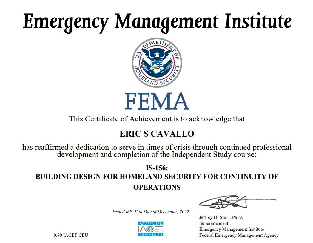 •And the last but not least announcement to the Earthly Infrastructure 2022 annual update that we are proud to announce is company Founder, Eric S. Cavallo’s completion of the FEMA/DHS “Building Design for Department of Homeland Security Continuity of Operation Facilities”.